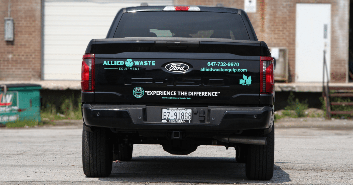 Rear view of a Ford F-150 presented with Allied Waste Equipment decals.