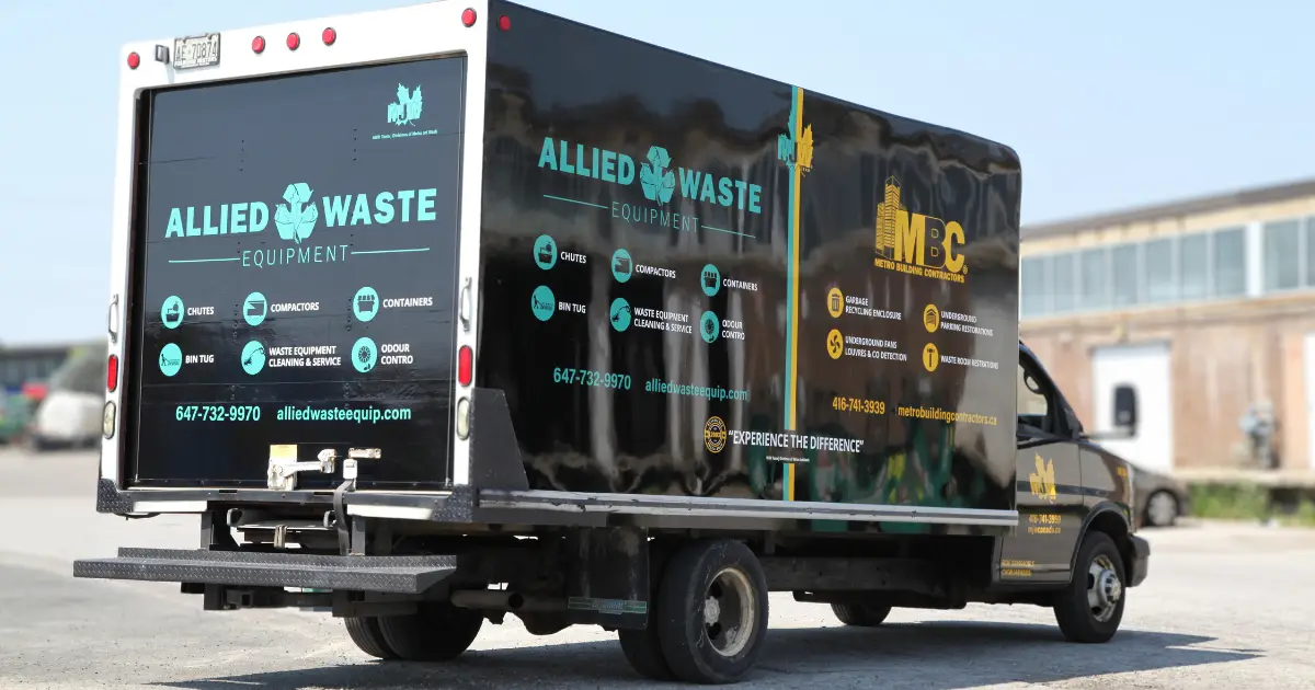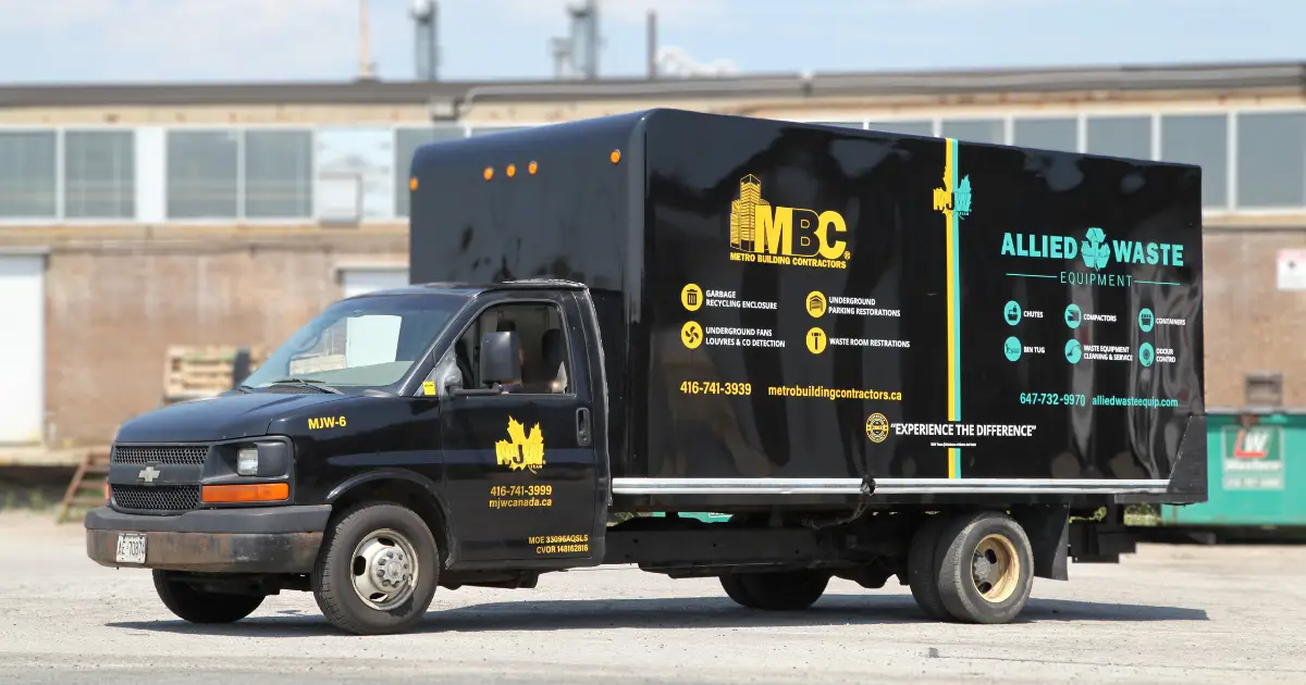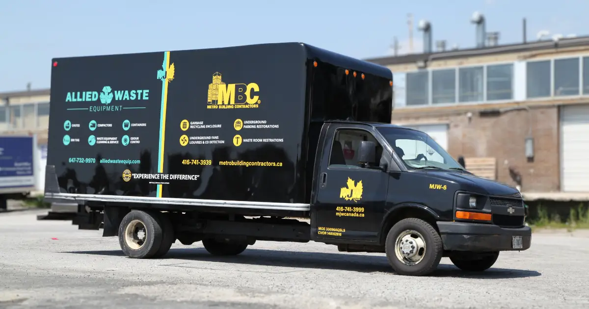 Our team crafted wrap decals on a Chevy box truck for Metro Jet Wash, featuring a black vinyl background to highlight vibrant yellow and blue accents. The phone number and website are displayed for passersby. Project details are down below.