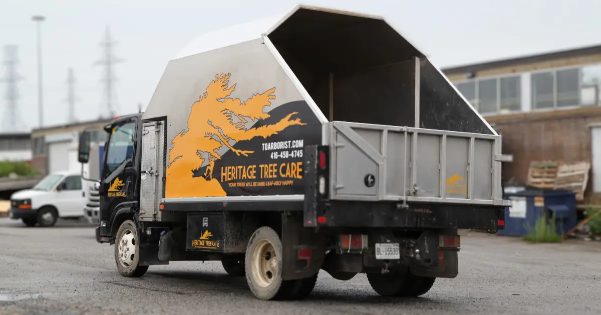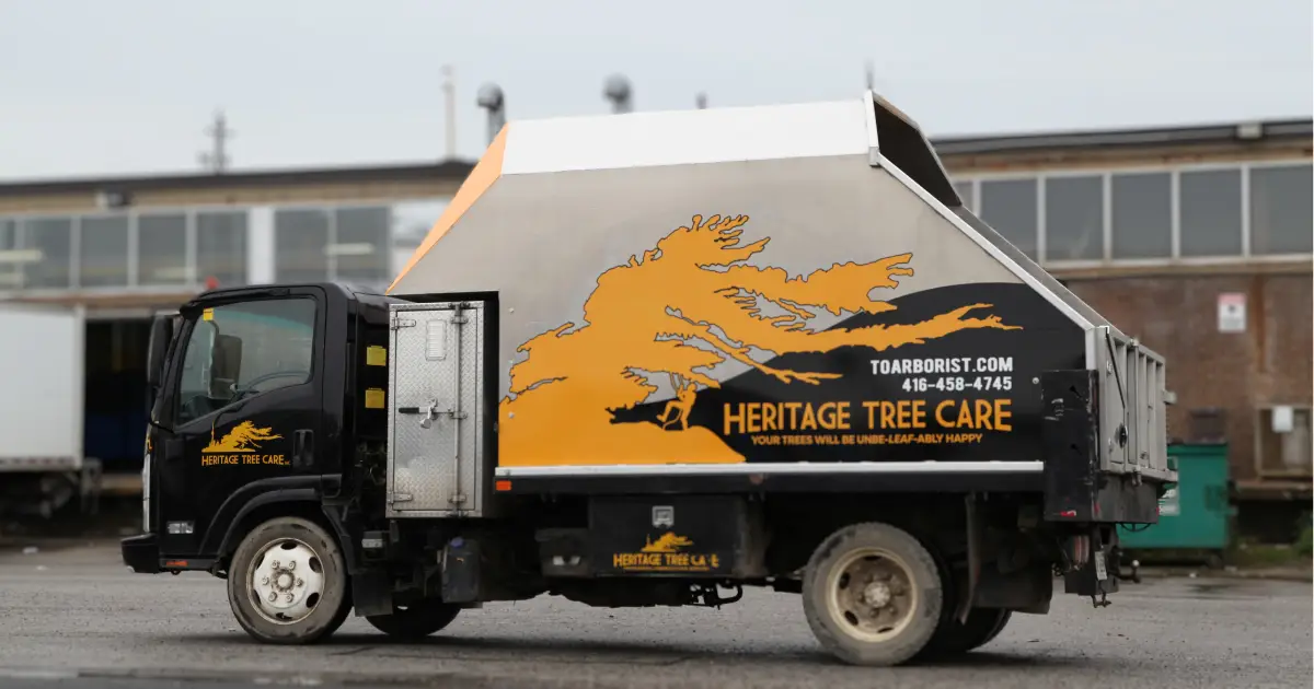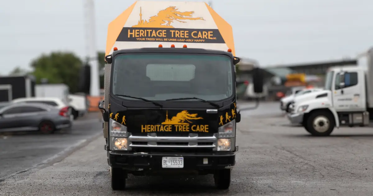 Our team designed wrap decals for Heritage Tree Care, featuring a black partial vinyl with bright yellow detailing to catch the eye. Their phone number is prominently displayed on the side of the truck. Below are more details on this project transformation.